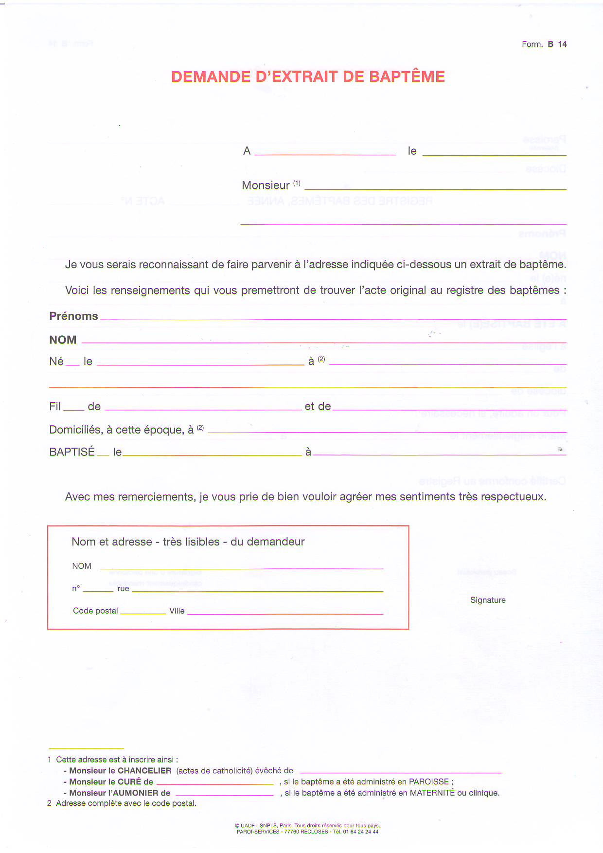 En cas de demande d'extrait de baptême pour une personne qui n'est pas de votre famille, demandez qu'il soit envoyé à la paroisse où a lieu la cérémonie.